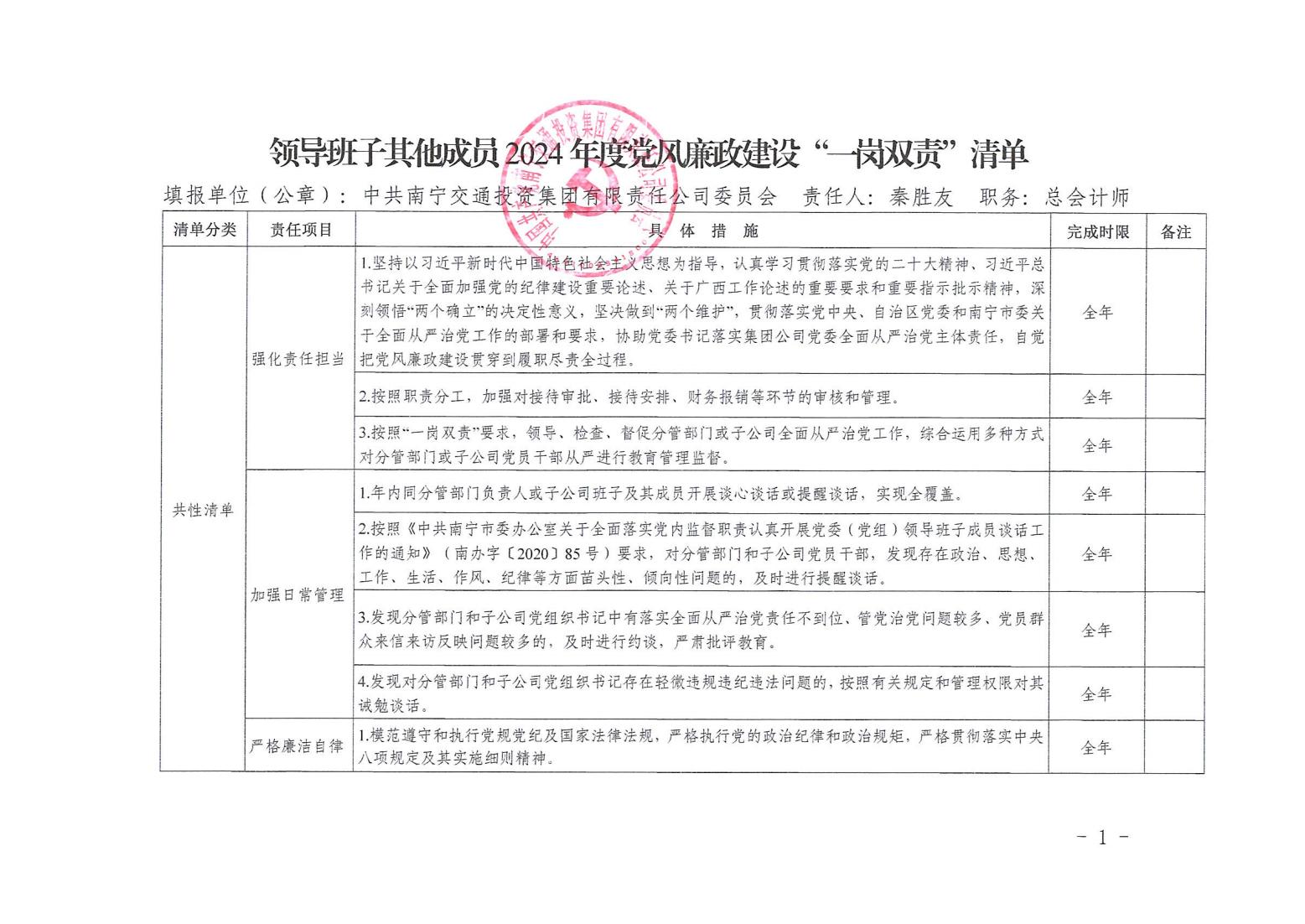 領導班子其他成員2024年度黨風廉政建設“一崗雙責”清單(七)