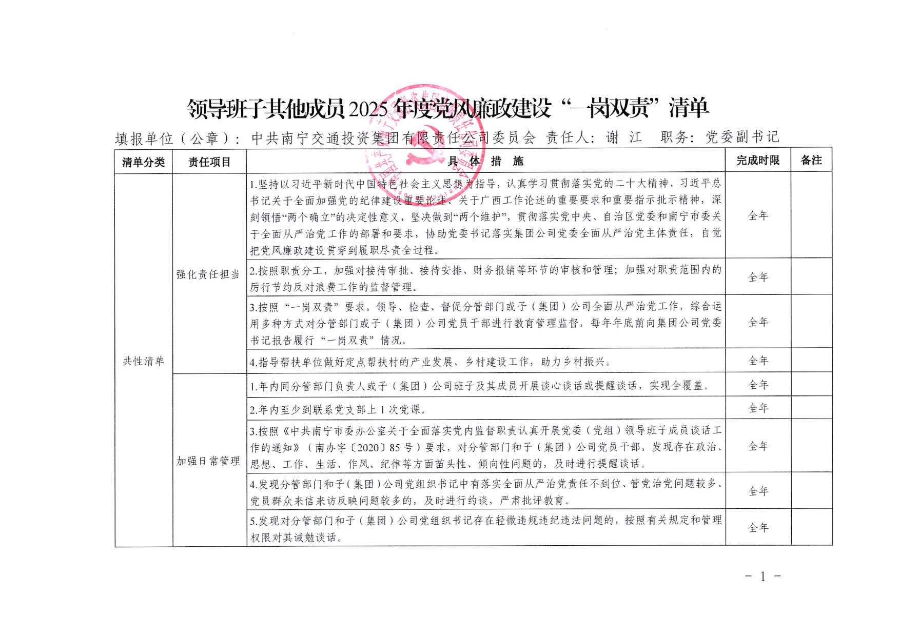 南寧交投集團領(lǐng)導(dǎo)班子其他成員2025年度黨風(fēng)廉政建設(shè)“一崗雙責(zé)”清單(一)